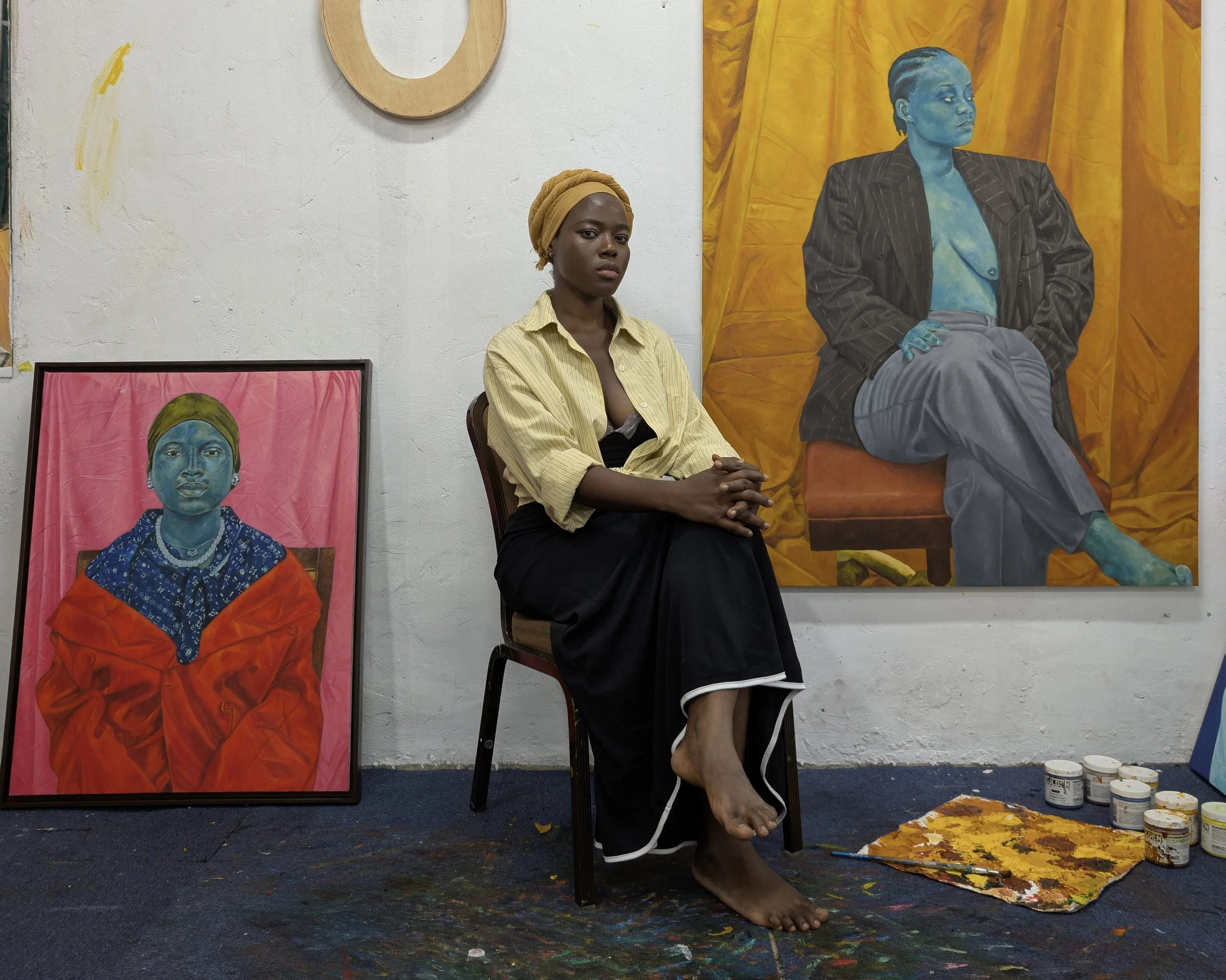Awanle Ayiboro Hawa Ali, a Ghanaian visual artist born in 1997, delves into the realities faced by African women living within a patriarchal society. Having grown up in a strict Muslim household as the eldest daughter, Hawa experienced the weight of societal expectations and the pressure to conform to traditional norms. Despite initial resistance, her exposure to the visual art domain and the guidance of supportive mentors ignited her latent passion, empowering her to break free from imposed expectations. Hawa's artistic exploration is deeply rooted in the intricate tapestry of her environment, serving as an anthem of liberation that portrays women adorned in suits. Dedicated to extensive research, experiments, and ceaseless artistic exploration, she navigates the delicate balance between tradition and liberation within the sacred intimacy and complexities of home.